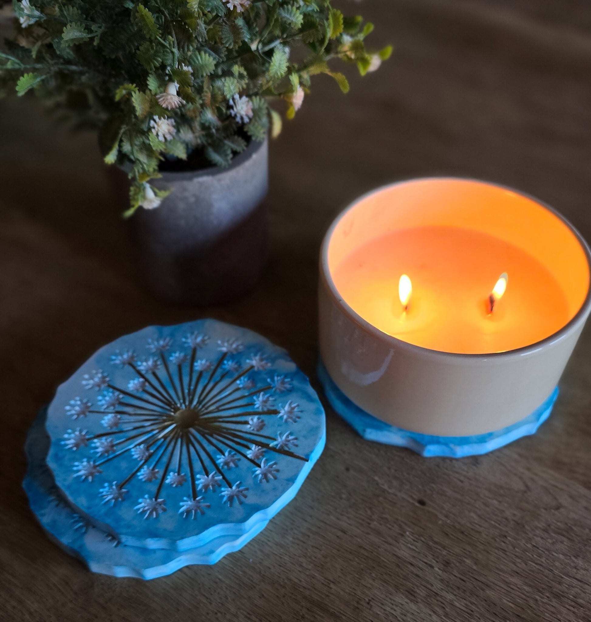 Dandelion cement Coaster Set, Blue and white coaster decor, hot or cold beverage coasters