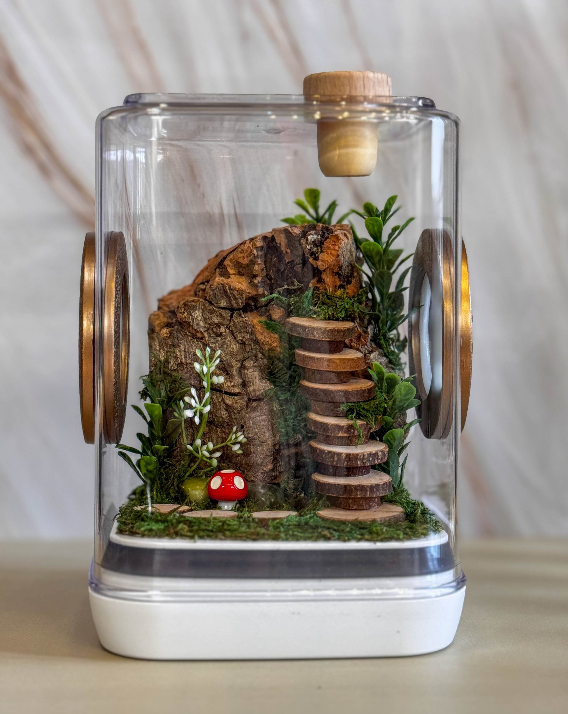 PLEASE READ: A humid environment can encourage mold and bacteria which is not safe for your spider. Wood items in enclosure are sealed against moisture to protect them from molding quickly. Although items are sealed, EXCESSIVE MISTING AND MOISTURE CAN CAUSE MOLD. When misting enclosures, it should be a light mist and done to the sides of the enclosure to discourage mold or bacteria growth. Avoid spraying directly on cocoon hide. I advise cleaning and inspecting your enclosure weekly. Wet a q-tip or paper towel and wipe down plants and wood items. This prevents mold and bacteria from forming. (see Care instruction card included with your item)