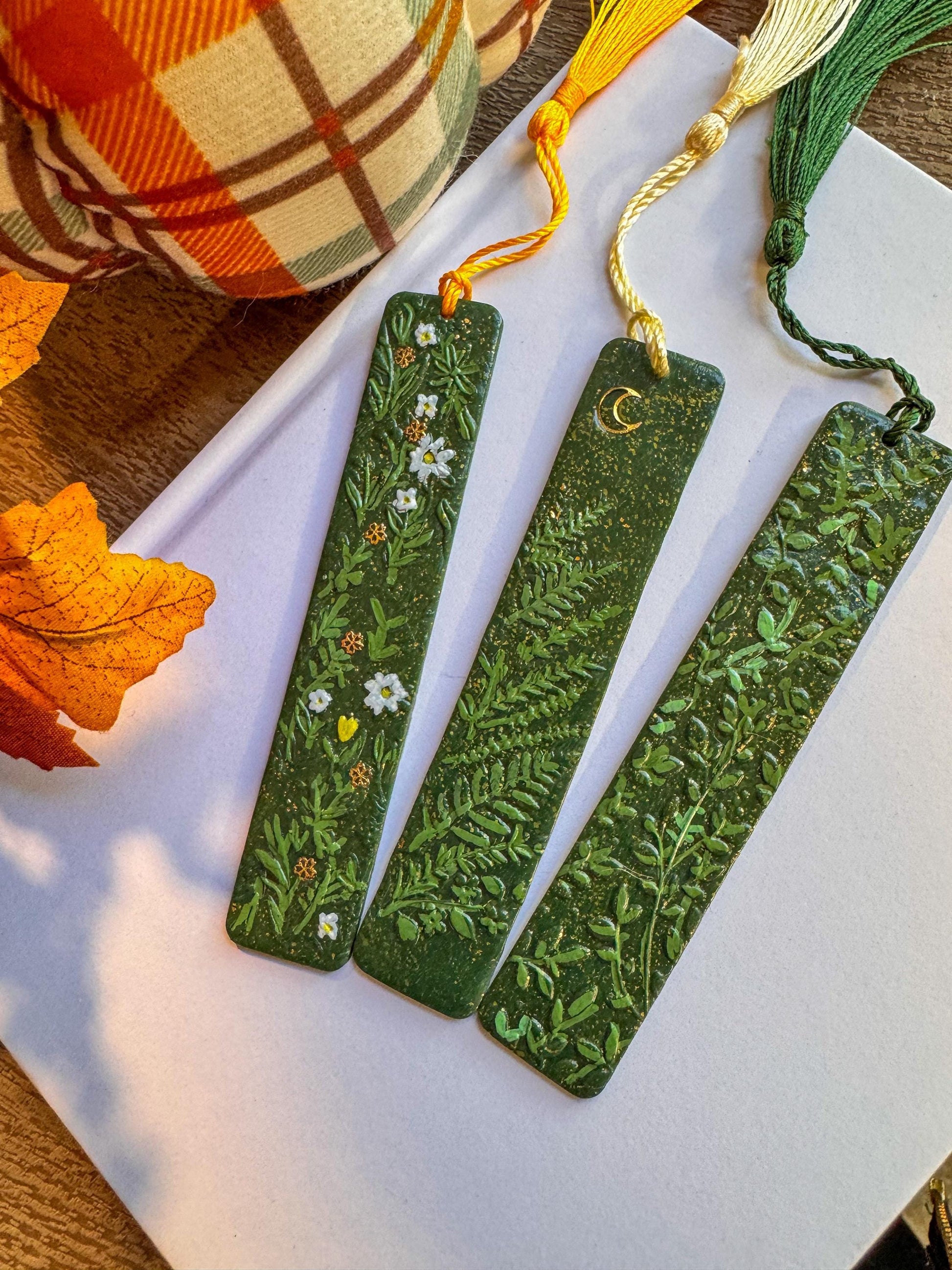 Tassel color can be changed. Message me if you’d like to see all the colors I have available. Handmade polymer clay bookmarks are made by using a clay insert to achieve beautiful, raised patterns of leaves and flowers. Bookmarks are accented with gold foil. 2 of the bookmarks have additional gold tiny flower and moon accents. All have been painted with acrylic paint to add a touch of color and then sealed with a satin clay sealer to protect the plant. Bookmarks are a beautiful and practical accessory that can add a touch of elegance and style to any book. They can be a great gift for any book lover! Slip it between the pages of your favorite book and enjoy. Each bookmark will be a unique, one-of-a-kind accessory to your book and comes encased in a black bookmark holder which is perfect for gift giving! Size: 4.5 x .75 inches. Very thin. I do my best to make each item to the best of my ability, but with any handmade item, there may be minor imperfections. Bookmarks have been finished with a clay sealer. To clean your bookmark simply run under water and towel dry.